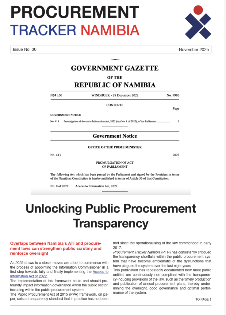 Procurement Tracker Namibia Issue 30 (November 2025) explores how the Access to Information Act of 2022 can strengthen transparency and accountability in public procurement. It highlights overlaps between the ATI and public procurement laws and reviews the draft Public Procurement Amendment Bill of 2025, which proposes stronger disclosure, compliance, and oversight measures.